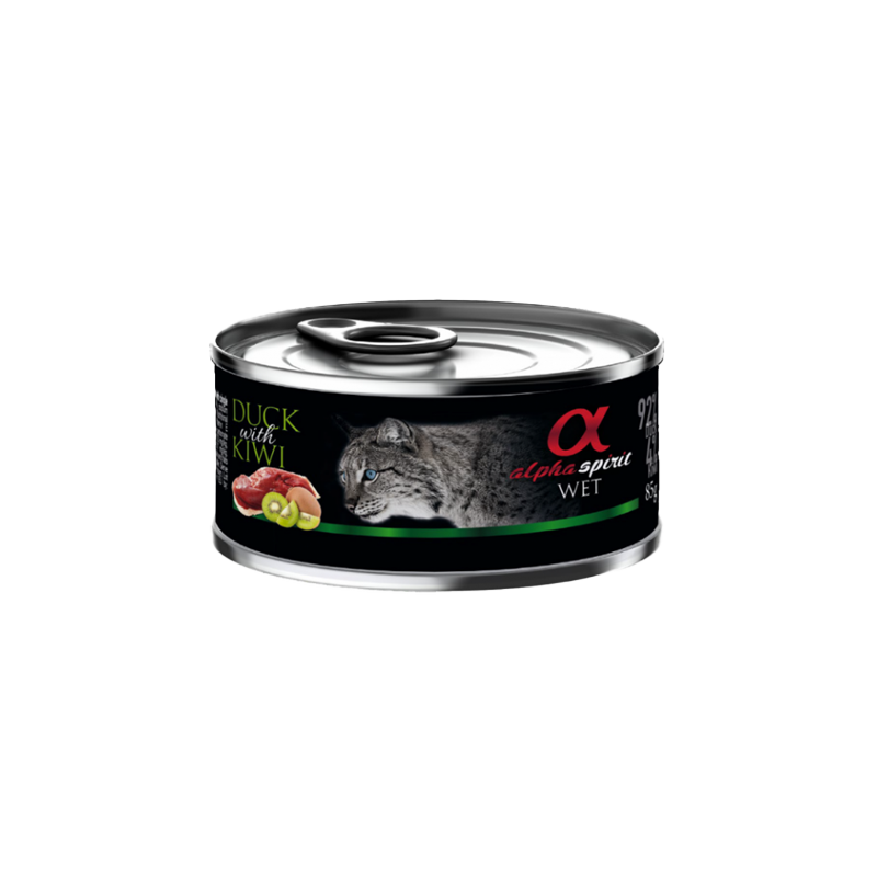 Alpha Spirit Hrana za Mačke Patka i Kivi. Potpuna mokra hrana za mačke osigurava esencijalne hranjive tvari za podršku probavi i imunitetu.