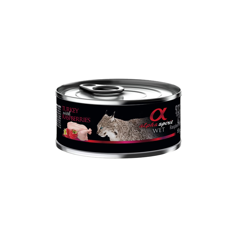 Alpha Spirit Hrana za Mačke – Puretina i Malina Potpuna mokra hrana za mačke osigurava esencijalne hranjive tvari za podršku probavi i imunitetu.