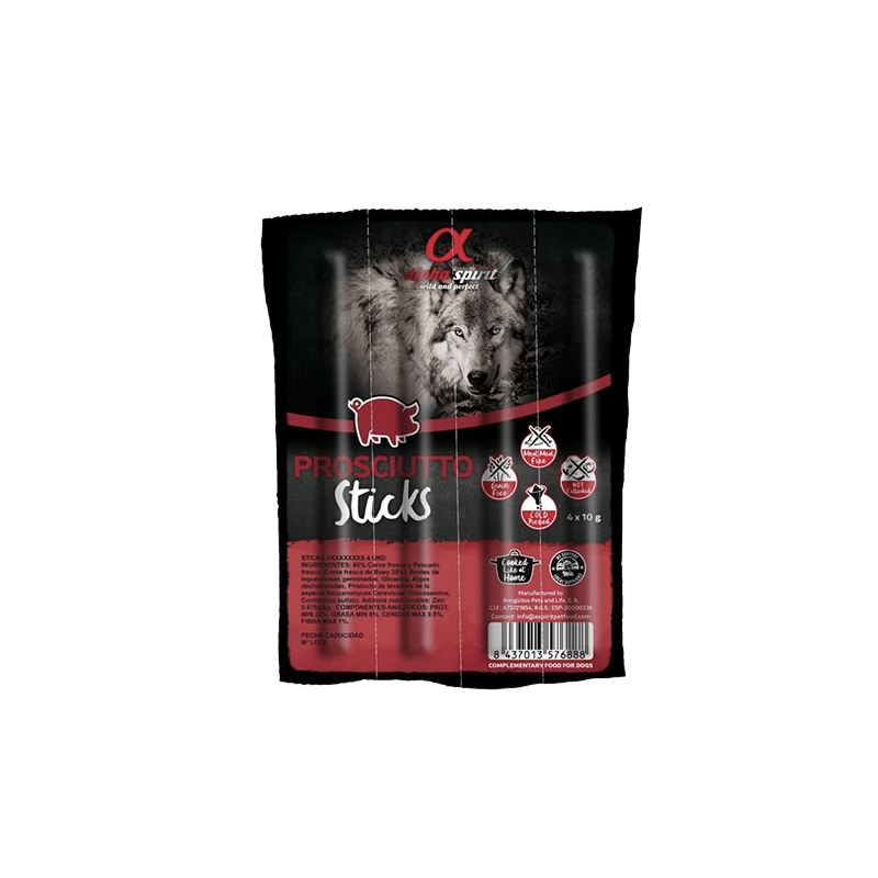 Alpha Spirit Štapići Pršut, niz od 4 štapića po 10gr. Dodatak prehrani za kućne ljubimce, za pse. Vrlo ukusne, lako probavljive, polu-vlažne poslastice, na koje je vrlo mala mogućnost pojave alergijske reakcije.