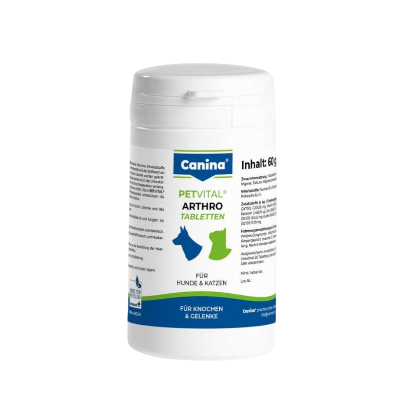 PETVITAL ARTHRO TABLETE dodatak prehrani za pse i mačke. Povoljno djeluje na izmjenu tvari u kostima i na slabe zglobove. Usporava proces starenja zglobova. Zadržavajući ione u tkivu povećava gipkost koštane mase i tetiva. Ublažava bolove. Ubrzava regeneraciju kostiju nakon lomova i kirurških zahvata. Preporučuje se nakon uklanjanja crijevnih parazita, kod poremećaja u rastu.