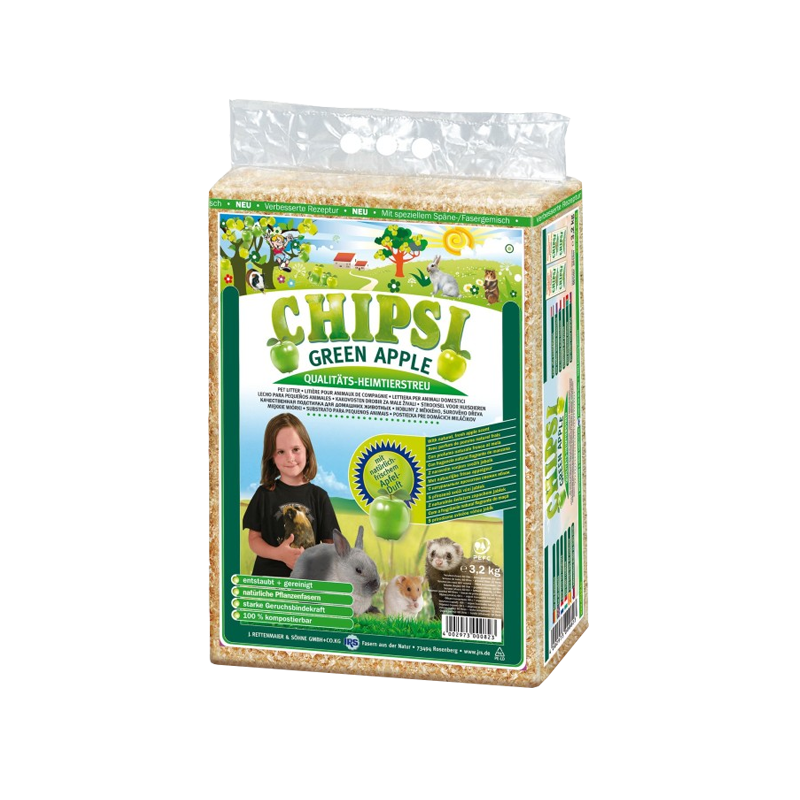 Chipsi drvene strugotine sa mirisom zelene jabuke osiguravaju meko i čisto stanište malim glodavcima. Ne stvaraju prašinu, odlikuju se velikim kapacitetom upijanja vlage te odstranjuju neugodan miris. Ove stelje apsolutno su suhe i sterilne.