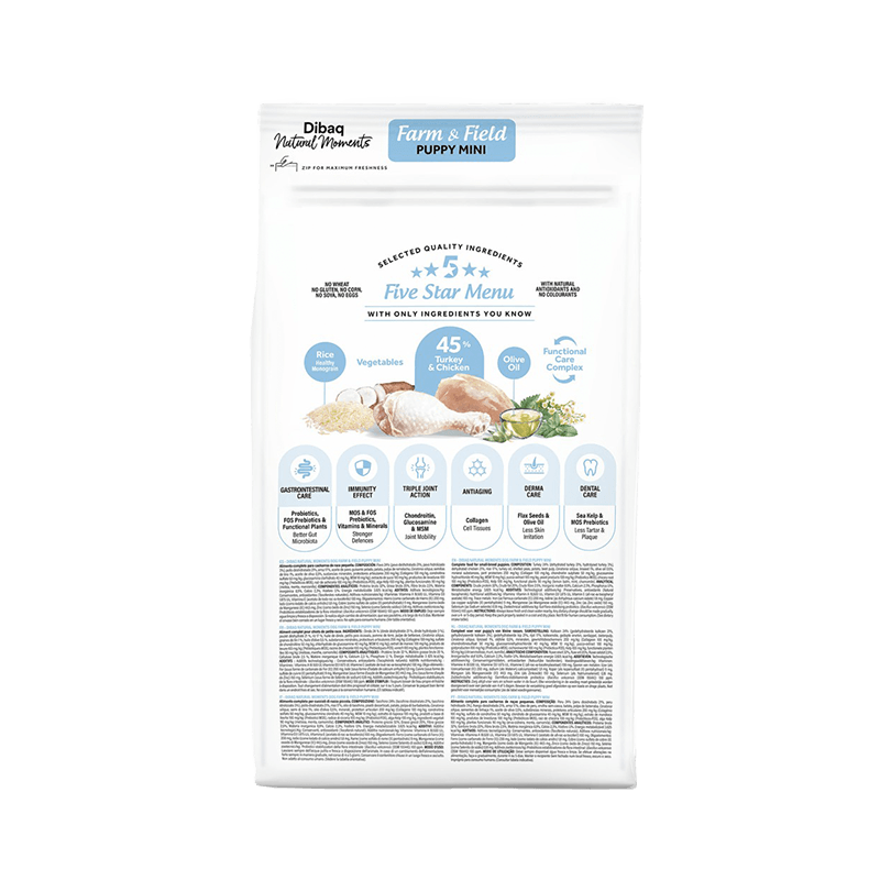Pripremljena od svježeg mesa puretine i piletine kao glavnim izvorom lako probavljivih životinjskih bjelančevina i rižom kao jedinom žitaricom-Monograin formula. Ova prehrana pridonosi uravnoteženoj i zdravoj probavi kao i pravilan rast i razvoj šteneta u prvim mjesecima života. Male granule (6-8 mm promjera) prilagođene su maloj čeljusti mini štenaca te pružaju neodoljiv okus! Dodatno obogaćena prebioticima i probioticima (FOS i MOS), kolagenom, kondroitinom, glukozaminom, kelp algama i maslinovim uljem što pridonosi razvoju zdrave crijevne mikroflore, podupire i jača imunološki sustav, te brine o zdravlju kože, dlake i usne šupljine. S prirodnim antioksidansima, bez umjetnih boja i konzervansa, Dibaq Puppy Mini je savršena opcija za zdravi početak života vašeg šteneta na najprirodniji mogući način.