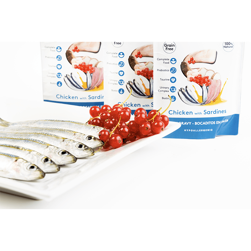 Komadići**: Piletina 64%*, Sardine 20%*, škrob tapioke 1,4%*, mineralne tvari, dehidrirane brusnice 0,4%*, inulin (prebiotik) 0,4%*. Prirodni sastojci*