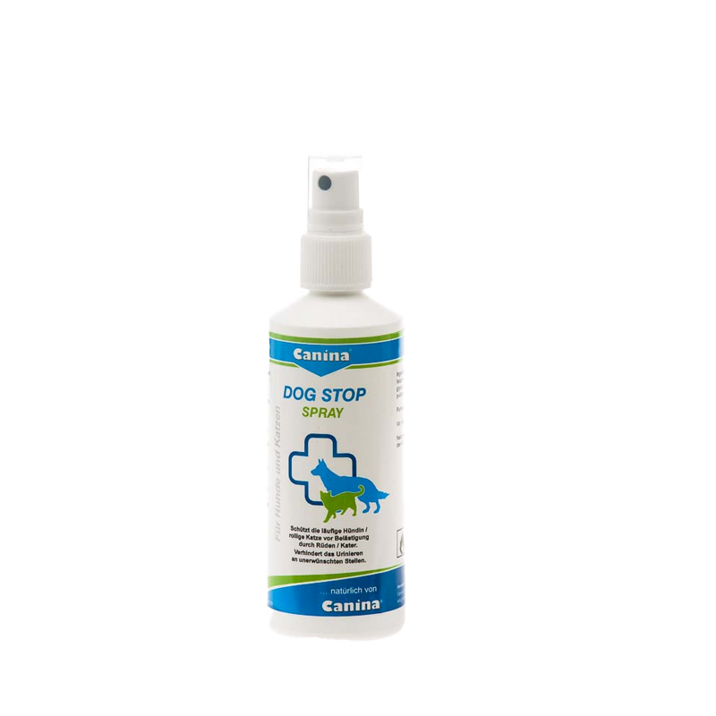 CANINA Dog Stop spray 100 ml. Neutralizira miris u vrijeme tjeranja. Djeluje tako da miris ženke neutralizira ili ga tako promijeni da mužjake više ne privlači. Djeluje vrlo brzo.