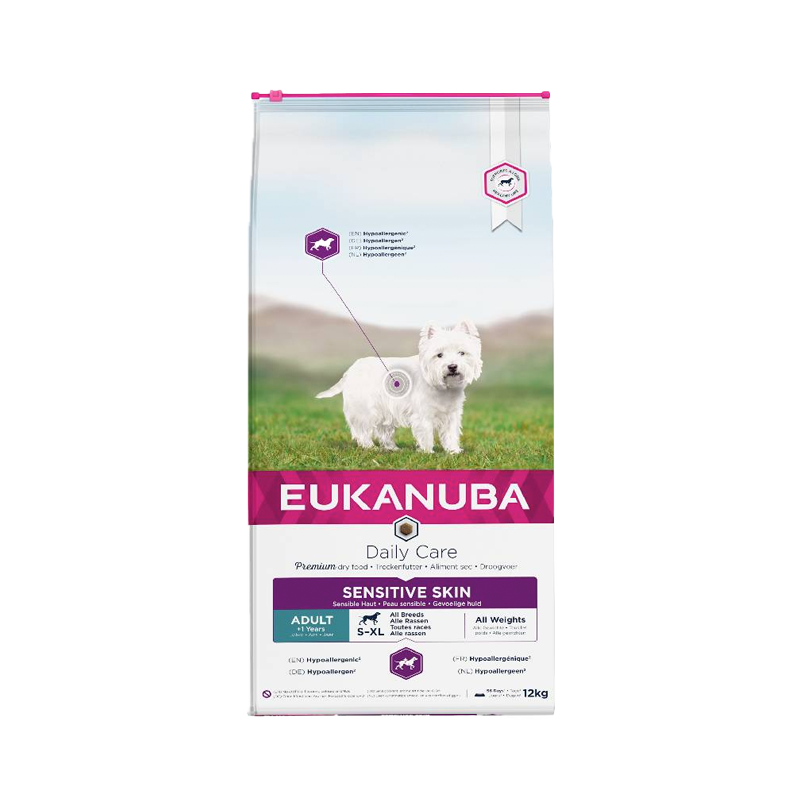 Eukanuba Daily Care Sensitive Skin suha hrana za pse s osjetljivom kožom formulirana je tako da ograniči namirnice koje mogu prouzročiti svrbež. Ova hrana je hipoalergena (ali je proizvedena u tvornici u kojoj se prerađuju i žitarice) posebno je formulirana za osjetljive pse, stoga koristi samo jedan izvor bjelančevina (ribu). Dodatno, formula je obogaćena prirodnim izvorima Omega 6 i r masnih kiselina za zdravu kožu i dlaku. Poseban heksagonalan oblik granule uz jedinstven Denta Defense pomaže u održavanju dentalne higijene. Eukanuba Daily Care suha hrana za osjetljivu kožu bogata je ribom. Ovaj prirodan izvor visoko kvalitetne bjelančevine poodržava razvoj mišića. Posebno prilagođena mješavina vlakana prebiotika i pulpe repe pospješuje zdravu probavu. Hrana je 100% potpuna i uravnotežena, idealna za odrasle pse svih pasmina.