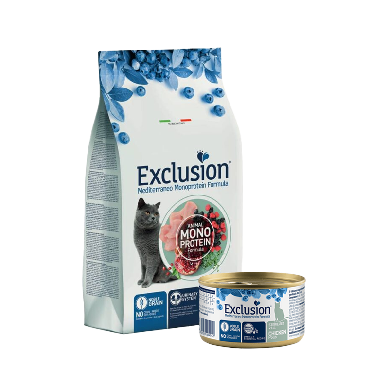 Kompletna hrana formulirana s jednim izvorom životinjskih bjelančevina. Cjelovita i izbalansirana hrana, formulirana s bjelančevinama iz jednog izvora, isključivo životinjskog podrijetla. Ova specifična formula pomaže održavanju zdravlja mokraćnog sustava, a očuvana je prirodnim antioksidansima. Hrane je također obogaćena inovativnim receptom hranom iz tradicionalne mediteranske tradicije: šipak, kupine, ribiz, maline i borovnice. Obogaćen je psiliumom te pomaže u sprečavanju stvaranja kuglica od dlaka. Exclusion Mediterraneo Hrana prilagođena je svim prehrambenim potrebama mačke.