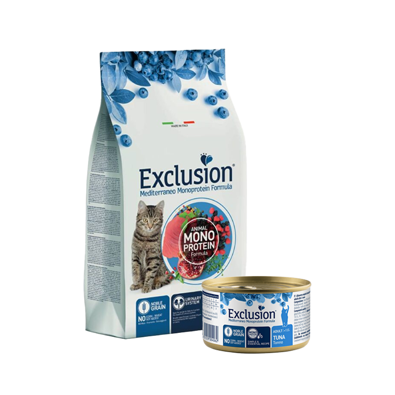 Cjelovita i izbalansirana hrana, formulirana s bjelančevinama iz jednog izvora, isključivo životinjskog podrijetla, za jasan i jednostavan recept i od samo jedne visokokvalitetne plemenite žitarice (riže). Ova specifična formula pomaže održavanju zdravlja mokraćnog sustava, a očuvana je prirodnim antioksidansima. Hrane je također obogaćena inovativnim receptom hranom iz tradicionalne mediteranske tradicije: šipak, kupine, maline i borovnice. Obogaćen je psiliumom te pomaže u sprečavanju stvaranja kuglica od dlaka. Exclusion Mediterraneo Hrana prilagođena je svim prehrambenim potrebama mačke. Hrana Exclusion Mediterraneo Adult Tuna je bez pileće masnoće, soje i kukuruza.