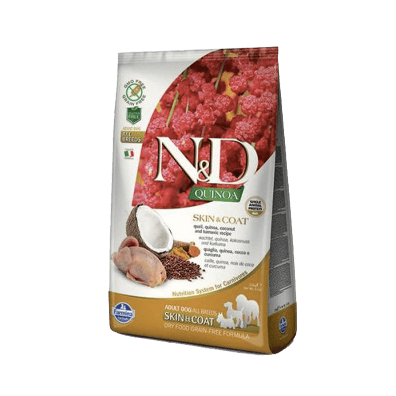 Svježa prepelica (18%), dehidrirana prepelica (18%), škrob iz graška, riblje ulje (iz haringe), sjemenke kvinoje (8%), laneno sjeme, sušeni kokos (2,5%), kurkuma (2,5%), inulin, fruktooligosahaidi, ekstrakt kvasca (izvor mannanoligosaharida) kalcijev karbonat, dikalcijev fosfat, buhačica, kalijev klorid, kuhinjska sol, suhi pivaski kvasac, glukozamin, kondroitin sulfat, ekstrakt nevena (izvor luteina).