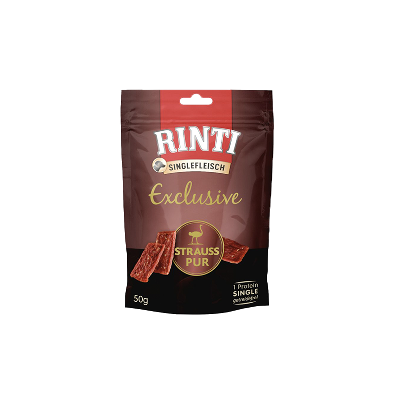Dopunska hrana za odrasle pse. Grickalica za pse s posebnim zahtjevima. Vrhunska kvaliteta s jednim izvorom bjelančevina, od ekskluzivne životinjske vrste. Ekskluzivno meso noja idealno je za pse koji mogu biti alergični na ostale vrste mesa koje se češće koriste. Kao i svi Rinti snack proizvodi, Exclusive Snacks se nježno suše na zraku i pripremaju bez mesnog brašna, žitarica, soje i šećera. Vrećica koja se može ponovno zatvoriti čuva proizvod dugo svježim. Nakon otvaranja čuvati na hladnom i suhom mjestu i potrošiti u roku od dva tjedna. Odvlaživač zraka koji se nalazi unutar pakovanja čuva svježinu proizvoda i nije za konzumaciju.