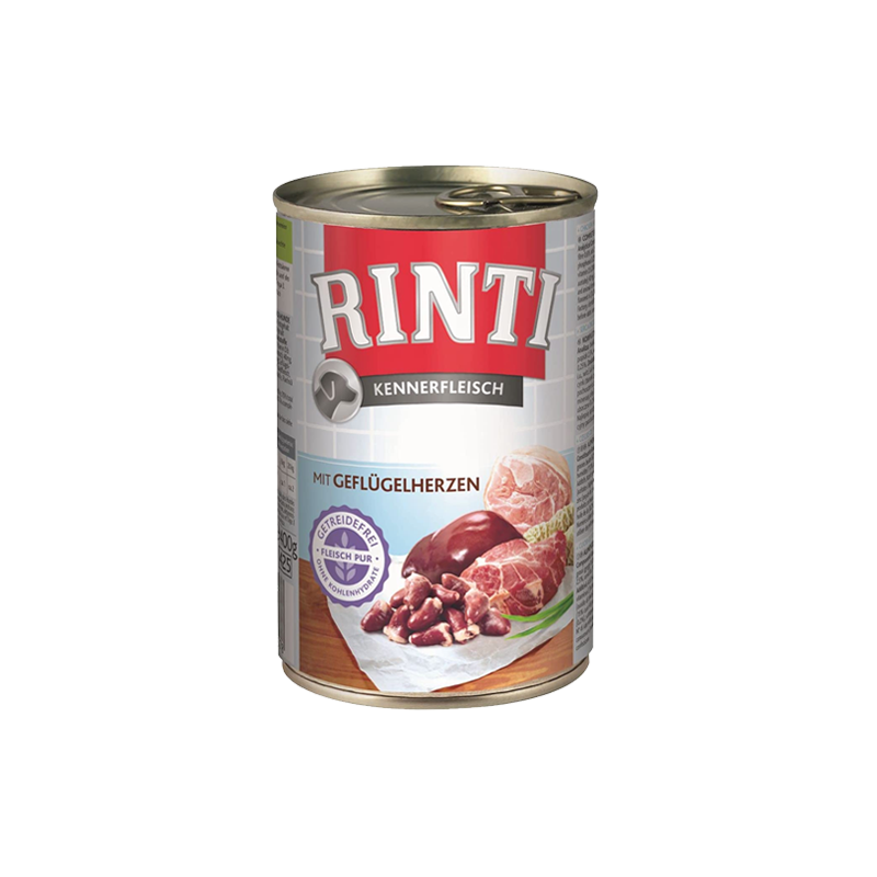 RINTI KENNERFLEISCH sa Srcima peradi. Potpuna, vlažna hrana za kućne ljubimce, za pse. Sadrži do 70% mesa i iznutrica, bogata prirodnim komadima mesa – što obilježava pravi Rinti Kennerfleisch obrok. Sadrži omega 3 masne kiseline za jačanje imuniteta i zaštitu stanica te repina vlakna, bogata balastnim tvarima za regulaciju probave.