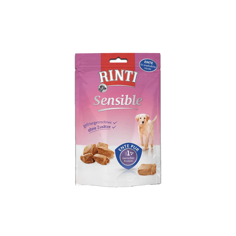 Rinti Sensible Snacks dopunska je hrana za odrasle osjetljive pse, s probavnim tegobama; poslastice sa samo jednom životinjskom bjelančevinom. Rinti Sensible Snacks se suše zamrzavanjem u vakuumu u složenom proizvodnom procesu s naknadnom sterilizacijom. Kao rezultat, mogu se izostaviti bilo kakvi aditivi. Mesna grickalica ne sadrži šećer, gluten, žitarice, boje i konzervanse. Time se smanjuje rizik od alergija i intolerancije na hranu. Rinti Sensible Snacks također se mogu hraniti kao nagrada tijekom eliminacijske dijete.