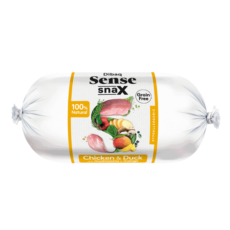 Dopunska prehrana za pse svih pasmina u obliku salame spravljena od ukusne svježe piletine i patke, uz dodatak manga, borovnica, jabuka i šampinjona. Proizvod se može poslužiti samostalno ili kao dodatak glavnom obroku. Proizvod ne sadrži žitarice.